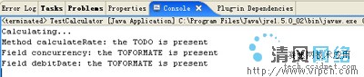 这个例子中定义了两个注释:TODO和TOFORMATE。在MyCalculator类中,TODO用来修饰方法calculateRate,而TOFORMATE用来修饰类变量concurrency和debitDate。而在类TestCalculator的main函数中,通过Java反射特性,我们查找到使用这些注释的类变量和方法。清单12-清单15分别显示这些类的定义。