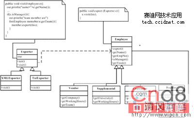 使用Vistor模式,首先我们在Employee这个类中加入eXPort方法,export方法如图7所示。Export方法接受Exporter对象作为参数,并在方法体中调用exporter对象的visit()方法。