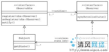 由于给定主体的观察者链表需要动态的变化,因此一个主题不能维护一个静态的观察者链表。因此关注于主题状态的任何对象都需要明确地注册自己为主体的一个观察者。主题状态发生的变化,都需要通知所有的以注册的观察者。从主题接到通知以后,每一个观察者查询主题,使自己的状态与主题的同步。因此一个主题扮演着发布者的角色,发布信息到所有的以订阅的观察者。
