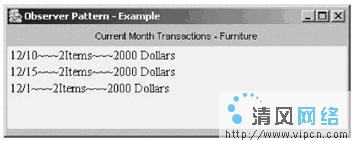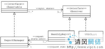 ReportManager类(Listing33.1)提供了声明在Observable接口中方法的实现。两个依靠于ReportManager的报表对象使用这些方法注册它们自己为观察者。ReportManager把这些注册的观察者保存到observersList矢量(vector)中。当前选择的分类构成了ReportManager对象的状态,它以实例变量的形式保存在变量department中。当为department设置一个新的值时(也就是ReportManager对象的状态改变),notifyObservers方法被调用。作为notifyObservers方法的一部分,ReportManager调用注册为观察者的refreshData(Observable)方法。