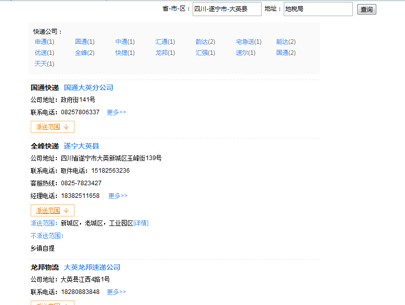 基于kuaidi100数据,查询快递网点的数据 对于做电商的可能有点用.可以做一个选择省市区的JS选择插件,也可以扒kuaidi100的,我这个显示有些样式问题,还有些JS没做判断,需要的同学自