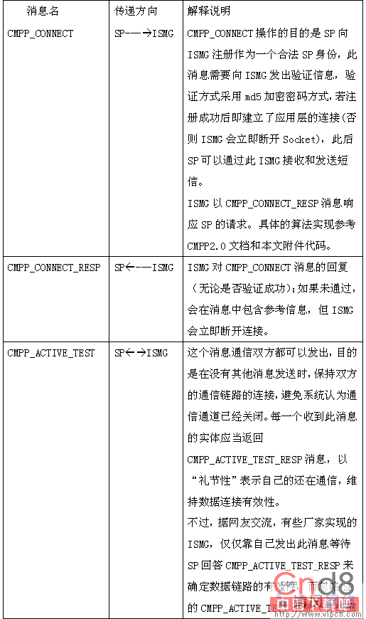 首先,图中的CMPP消息有很多种,SP同ISMG之间交流这些消息。大体上这些消息发出后,对方往往需要回复一个应答(RESP)类消息。注重,这些消息大多具有方向性,也就是说只能够从一端到另一端,而不可反方向进行,有些(少数)则可两端都能够发出。以下信息主要来源于移动的文档,但针对大家易混淆或源文档解释不够具体做了明确和补充。具体见下表: