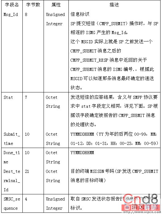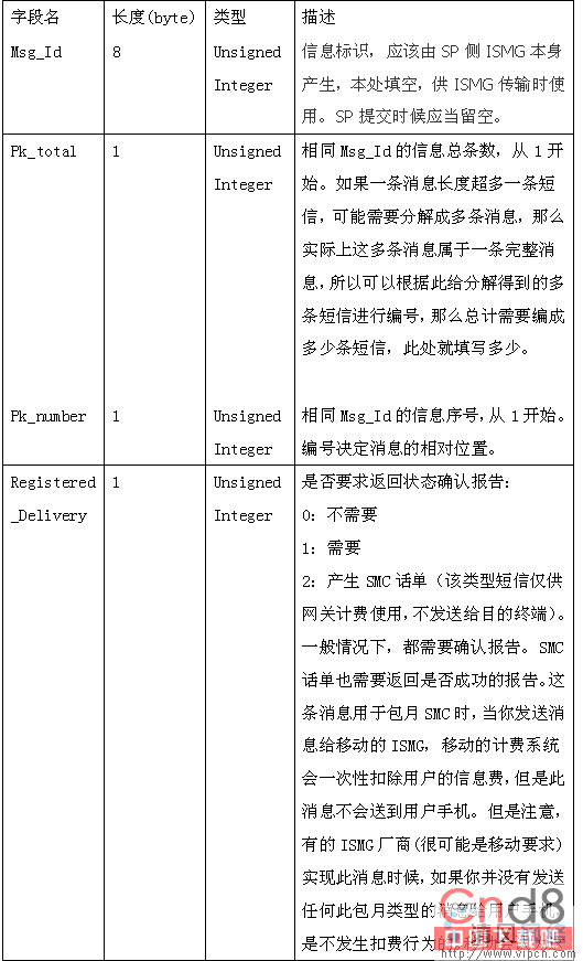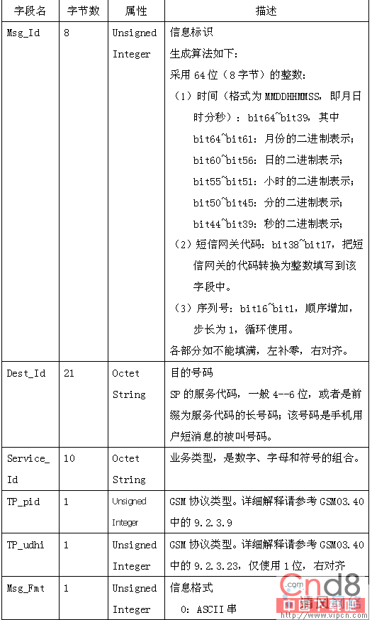 2、消息体。消息体长度根据消息不同,长度不一。其他的参考移动的文档《中国移动通信互联网短信网关接口协议(China Mobile Peer to Peer, CMPP)(V2.0)》,这里着重讲讲2个重要消息的消息体数据结构: