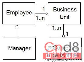 类Manager(经理)继续自类Employee,包含一个额外的属性,Managing Project.一个部门可能包含很多员工.多个部门构成了公司.暂不考虑公司这样的一个类,因为它在问题域之外.