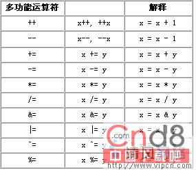 前面曾经说过 Java(TM) 和 C 一样,是一门语法功能很强的编程语言,它支持一些很酷的多功能运算符,如下表所示: 多功能运算符 解释 ++ 递增 (加 1) -- 递减 (减 1) += 增加(加指定值) -=
