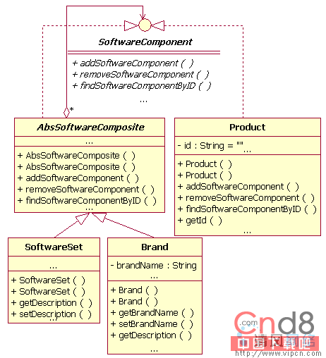 (3)SoftwareSet类继续于AbsSoftwareComposite类,对应于软件集,软件集下直接可以包含品牌(Brand),也可以直接包含不属于任何品牌的产品(Product)