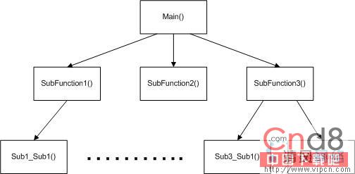 过程式设计还有一个问题就是其程序架构的依靠关系问题。一个典型的过程式程序往往如Figure 1所示: