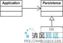 Application代表应用层的逻辑,DB代表了数据库访问的逻辑,在这个设计中,Application直接调用了DB的服务来将数据存储到数据库中。这样做的缺点是Application对DB有了依靠关系,一旦DB有了任何变化,Application都有可能会受其影响需要改动。当然,假如只是两个类的话,这种依靠关系根本算不上什么问题,然而,我们有理由相信,应用层和存储层都会由不只一个类组成,并都有一定的复杂度,这时它们之间的这种依靠关系就会让人头痛了。当程序的模块越来越多,假如不限制它们之间的联系,那模块间的依靠、程序的复杂度和开发维护的难度都会成指数上升。