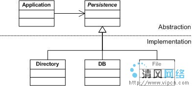 Persistence是一个接口,其包含了Application存储所需用到的服务。DB实现了这个接口,Application则调用Persistence中的服务来存储数据,两者都只依靠于Persistence。这样,Application到DB的依靠关系被Persistence这个接口切断了。因为接口中只包含了服务,也就是成员函数的声明,而不包括任何数据和函数的实现,所以Persistence接口的内容会很简单。在Persistence不变的情况下,Application和DB这两个模块都可以自由地进行修改而不影响到对方。就这样,通过在中间插入接口的方法,程序的模块被划分开,依靠关系也变得轻易治理的多。