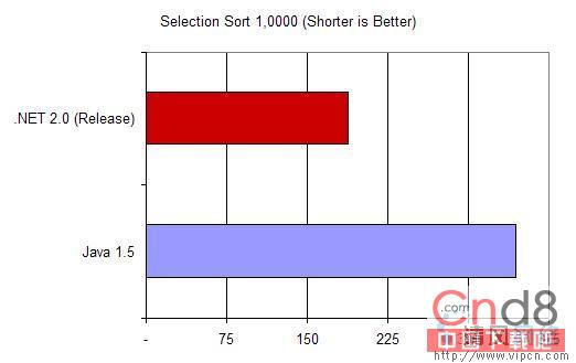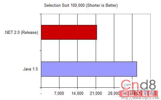 BentUser上一篇文章".NET vs. Java Shootout"中对.NET 2.0 与Java 1.5 的性能进行了标准测试,测试项目包括Selection Sort、Memory Efficiency。在第一项测试内容中,分别对1,000个和100,000浮点数进行选择排序,测试结果如下图。
