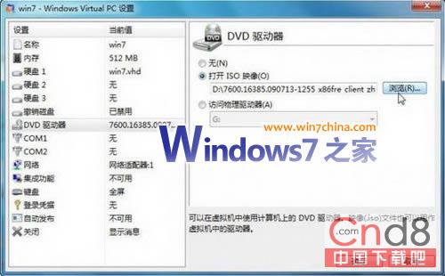 第6步、弹出设置对话框,切换到“DVD驱动器”设置项,由于我下载的是Windows7RTM旗舰中文版镜像,所以选中“打开ISO映像”单选按钮,并选择下载的镜像文件,开始在虚拟机中,安装Windows 7操作系统,如下图: