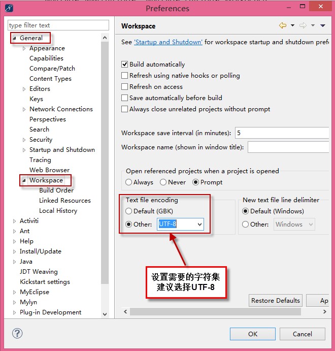 在Java的编程中编码一般都是使用UTF-8,但是MyEclipse一般默认的编码根据操作系统语言环境确定的,我们需要手动指定工作空间的默认编码格式。