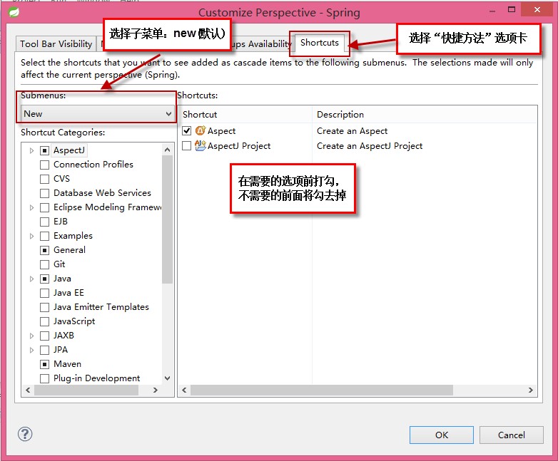 在window-->Customize Perspective中,切换到Shortcuts选项卡: