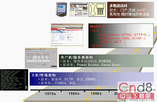 如下图所示, 人机界面技术随着计算机技术的发展而发展,从最初大机时代的终端,到后来C/S架构采用的GUI界面,到现在最流行的B/S架构的WEB界面。 而现在随着技术的发展,如无线移动通信技术、语音技术等的发展,人们希望能够通过各种设备,随时随地获取信息。这就对人机界面提出更高的要求, 企业门户技术应时而生,这就是新一代的人机界面。
