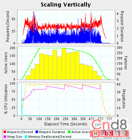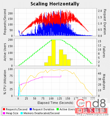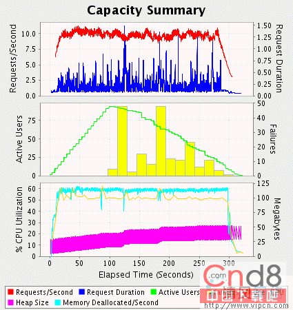 我在这篇文章中会使用相同的容量小结图。在执行负载测试时还有更多的可用信息,但这里只用了有用的部分。最上面的面板包含每秒完成的请求数和请求时间信息。第二个面板包含活动用户数和失败率,我将超时、不正确的服务器应答和长于5秒的请求认为是失败的。第三个面板包含JVM内存统计和CPU使用率。CPU值是所有处理器的用户时间的平均值,这里所有的测试机器都是双CPU的。内存统计图包含垃圾回收表和每秒垃圾回收数。