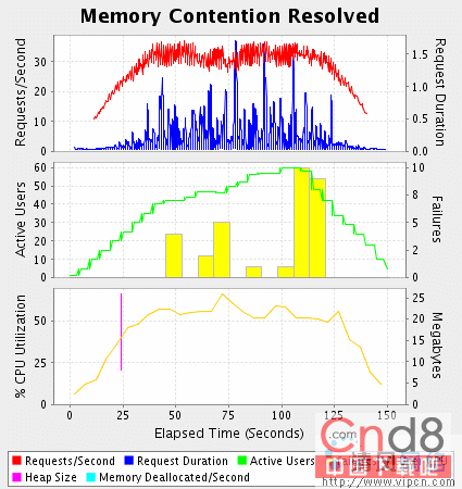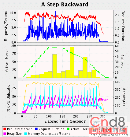 类很简单,但他们会产生两个很常见的问题。咋一看瓶颈可能由grindCPU()方法的同步修饰符引起,但实际上内存消耗才是真正的问题所在。如图1,我的第一个负载测试显示了常见的负载变化。在这里负载变化很重要因为你正在模拟一个高的负载。这种热身的方式也更精确因为避免了jsp编译引起的问题。我通常习惯于在进行负载测试前先进行单用户模拟。