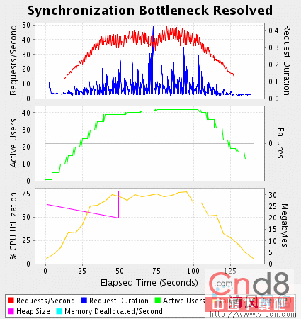 吞吐量有一定的增加,而且使用更少的CPU资源。竟争和非竟争性同步都是费时的,但通常最大的同步消耗是减少了系统的可伸缩性。我的负载测试不再满足系统的需求了,因此我增加了虚拟的用户数,如图5 所示。