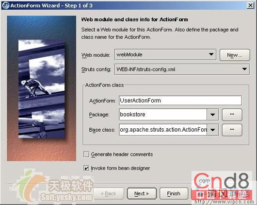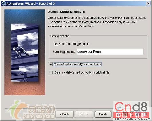 ActionForm比一般JavaBean强大的地方在于它可以进行数据检验,还可以进行数据复位。假如这个ActionForm最终要放到session中的,那么最好实现reset()方法,以复位ActionForm的数据,否则属性可能不会反映最新的值。这里, UserActionForm无需进行数据有效性校验,但由于UserActionForm最终需要放到session中,所以我们需要实现reset()方法。故此我们勾选Create/replace reset() method body选项。