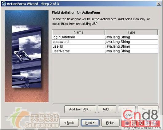通过Add...按钮为UserActionForm增加4个属性,如图 7所示。非凡的,假如这个ActionForm所对应的入口页面已经创建,你也可以直接通过Add from JSP...按钮,选择一个JSP页面,JBuilder会分析这个页面的表单,并将表单的数据组件名抽取为ActionForm的属性。