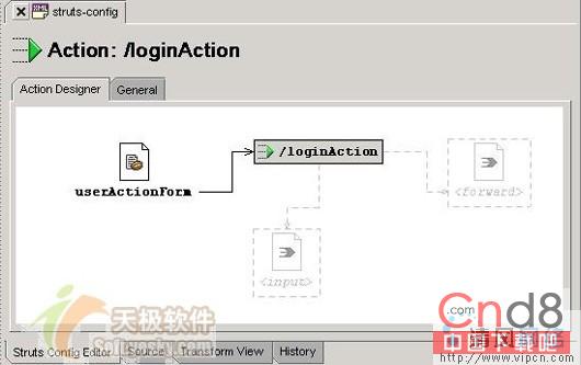 按Finish按钮直接创建LoginAction,JBuilder自动打开Struts Config Editor,生动形象地展现用户登录模块Struts框架下的处理流程,如图 11所示: