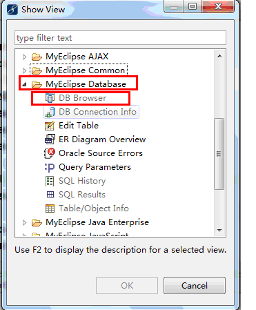 在MyEclipse中连接MySQL:window-->show view-->other-->MyEclipse Database-->DB Browser,如下图: