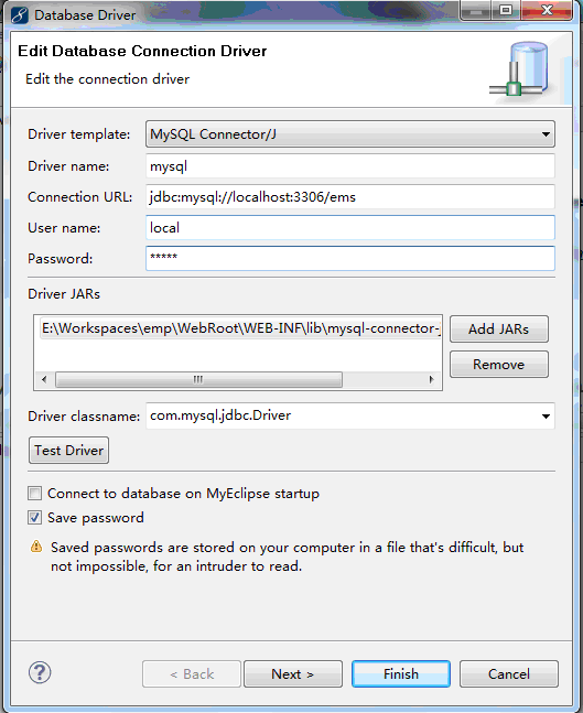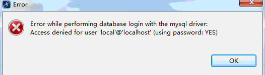 其中Driver name可以根据个人喜好填写,Connection URL当选择了Driver template以后会自动带出 jdbc:mysql://<hostname>[<:3306>]/<dbname>,此时将hostname的地方替换为localhost,把dbname替换为你所要连的数据库名字,然后将<、>、[、]等符号删掉,最终变为jdbc:mysql://localhost:3306/ems。当然,使用localhost必须保证MySQL安装在本地。接下来输入连接MySQL的用户名和密码,导入连接MySQL所需的驱动包。此时点击Test Driver报错:Access denied for user ‘local’@’localhost’(using password:YES),而朋友说他在安装MySQL的时候输入的用户名确实是local,密码是12345,而此时却怎么也连不上。
