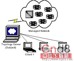 Observer模式(也称为发布-订阅)对设计包含一个服务器和多个客户端的类来说是非常有用的。他鼓励使用数据生成和使用分离的概念。一个来自网络治理的例子是一个服务器应用维护一个虚拟的设备网络拓朴图。他通过拉(主动请求)和(被动)听的组合来获取与设备和链接状态相关的消息。图1显示了一个服务器与一组网络设备通讯的方式。一组客户端通过Observer模式来得到服务器的数据。