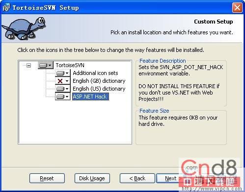 由于安装前没有仔细阅读发现说明,以为是TortoiseSVN对VS的Web项目有了什么新的支持,就选上了Asp.Net Hach安装项。