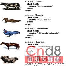 代码块被应用于整个Ruby中。最重要的是,代码块被Ruby内部地应用于象Array,Hash,甚至String这样一些类的iterator方法中。一个代码块其实就是,你定义要执行什么任务(典型地,是针对一个元素的任务)。为了进一步说明代码块和iterator的使用,我们提供了一个小例子。假定你定义了一些场院动物类(如图3所示),还有一个这些动物的数组,你可以通过在这个数组上使用一个代码块和一个迭代子来实现让每一种动物发声。