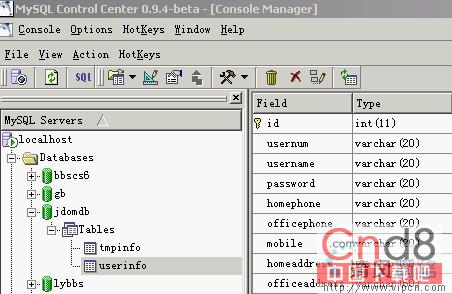 左侧部分就是表userinfo字段信息的。同时表tmpinfo的字段信息也是一样。这里我也提供了数据库的表结构文件jdomdb.sql,你只要建立好名为jdomdb数据库,然后将其导入就可以了。
