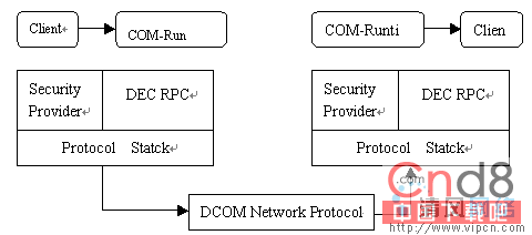 Microsoft的分布式COM(DCOM)技术是将组建对象模型技术COM大大进行了扩展,是对在局域网、广域网甚至是Internet上计算机对象之间的通信提供了完全的支持。通过使用DCOM用户的应用程序就可以在任何网络位置上达到真正的分布性,从而满足客户应用的需要。整体结构如下图所示: