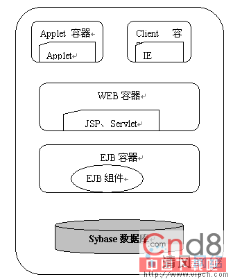 前台用户显示层使用jsp和servlet在浏览器上实现,中间使用EJB组件实现企业业务逻辑,后台数据库使用Sybase数据库。具体的企业应用结构如下所示: