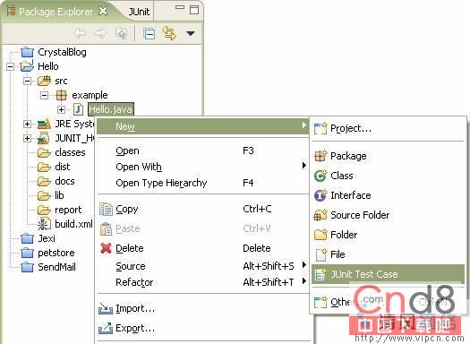 下一步,我们预备对这个方法进行测试,确保功能正常。选中Hello.java,右键点击,选择New->JUnit Test Case: