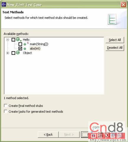 选择要测试的方法,我们选中abs(int)方法,完成后在HelloTest.java中输入: