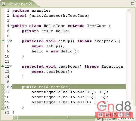 setUp()是建立测试环境,这里创建一个Hello类的实例;tearDown()用于清理资源,如释放打开的文件等等。以test开头的方法被认为是测试方法,JUnit会依次执行testXxx()方法。在testAbs()方法中,我们对abs()的测试分别选择正数,负数和0,假如方法返回值与期待结果相同,则assertEquals不会产生异常。