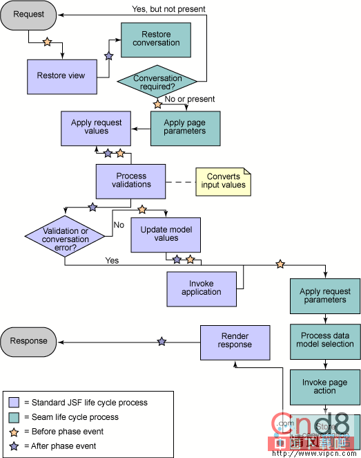JSF 的其他主要缺点还包括对 HTTP 会话的依靠过重(尤其是在一序列的页面之间传播数据时),简陋的异常处理,缺少书签支持,以及太多的 XML 配置。通过与 JSF 自然地集成,同时加入 JSF 规范委员会放弃的或者忽略掉的新功能,Seam 解决了很多这样的问题。Seam 的框架鼓励使用紧凑的、易读的、可重用的代码,并且避免了所有为解决上述问题而经常加入的 “粘连(glue)” 逻辑。图 3 涵盖了 JSF 生命周期中用于简化应用程序代码的大多数 Seam 扩展点: