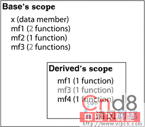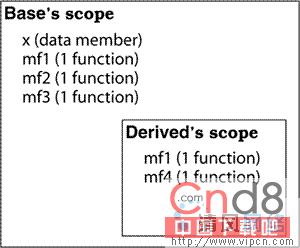 加入 inheritance 以后。我们知道当我们在一个 derived class member function 内指涉位于 base class 内的一件东西(例如,一个 member function,一个 typedef,或者一个 data member)时,编译器能够找到我们指涉的东西是因为 derived classes 继续到声明于 base classes 中的东西。实际中的运作方法是将 derived class 的作用域嵌套在 base class 作用域之中。例如:
