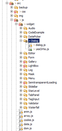 其他各类,都以Link的方式,挂在$Kit,以及$kit实例实例上,如math.js,包含了$Kit.Math类,以及$kit.math实例,这样保证全局范围里只有$Kit和$kit两个污染。同时,在kit.js,我们定义了一个命名空间叫做$kit.ui,在物理目录下,以kit.js同级的Widget目录,一字排开,多个首字母大写的目录