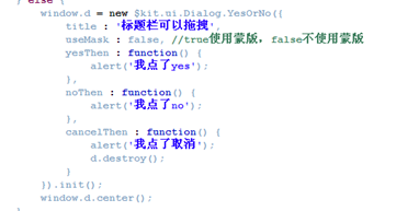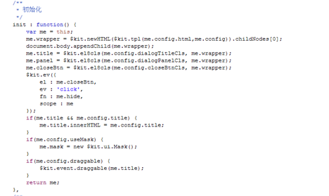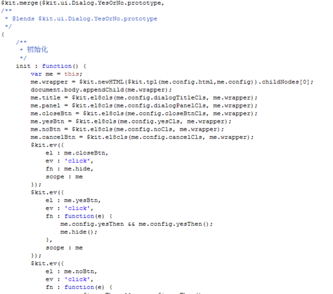 在使用kitjs的组件,首先是需要通过new Instance的方式new $kit.ui.Dialog.YesOrNo,初始化一个新的实例对象出来,这是仅仅是初始化了一个js的组件对象,还没有HTML,需要执行init方法,创建HTML,加入doc中,等于给灵魂浇上血肉^_^。