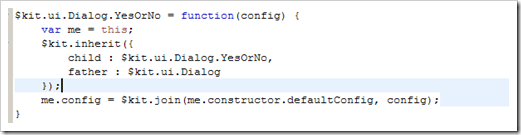 他通过$kit.inherit方法申明了与$kit.ui.Dialog对象的继承关系,这里会有同学要问,为什么要在构造器里面继承,而不是直接写在外面?