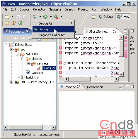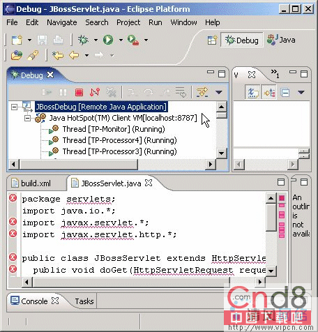 为部署在JBoss服务器上的servlet示例应用配置好debug设置后,我们就可以在Eclipse IDE中调试servlet应用了。参照“用Eclipse开发一个JBoss应用”一节所说的方法,用build.XML文件对修改后(引入了NullPointerException异常)的JBossServlet.class重新编译,为web应用生成新的webapp.war文件。在run批命令脚本中设定调试选项,以debug模式启动JBoss服务器。