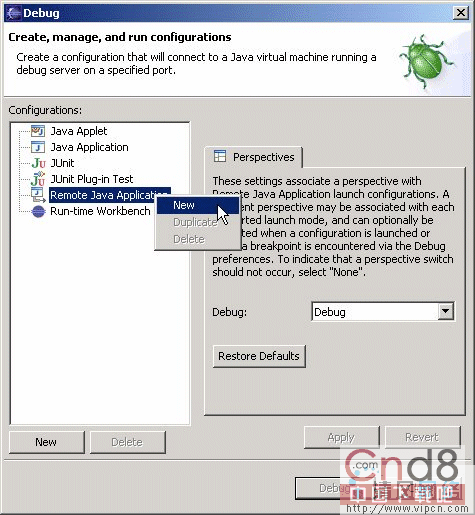 图中显示的是Debug屏。在该屏中选中Remote Java Application节点,右击节点选择New,如图12所示。