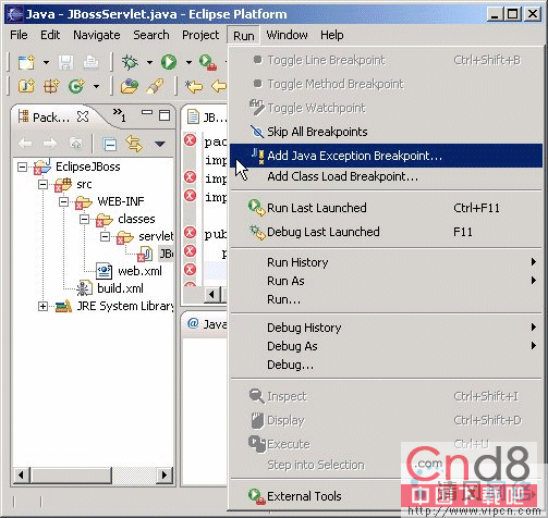 接下来,在JBossServlet.java文件中加入异常断点。此前我们已在JBossServlet中引入了NullPointerException异常。选择Run -> Add Java Exception Breakpoint在该servlet类中加入断点,如图14所示。