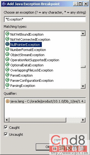在Add Java Exception Breakpoint屏中选择NullPointerException,如图15所示。NullPointerException断点被加入到servlet类中。