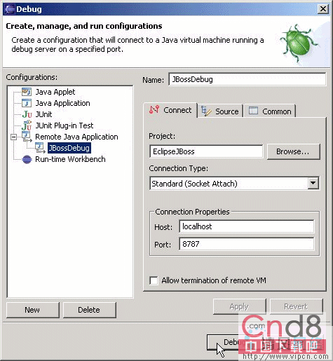 在Debug Configuration屏中为Debug设置指定名字。选中要调试的项目,也就是此前在Eclipse IDE中创建的EclipseJBoss项目。为Connection Type(连接类型)选择默认值,在Connection Properties(连接属性)中将Host指定为localhost,将Port(端口)指定为8787(JBoss服务器批命令脚本run中的端口设定值)。点击Apply按钮将此远程Java应用调试设置加入,如图13所示。