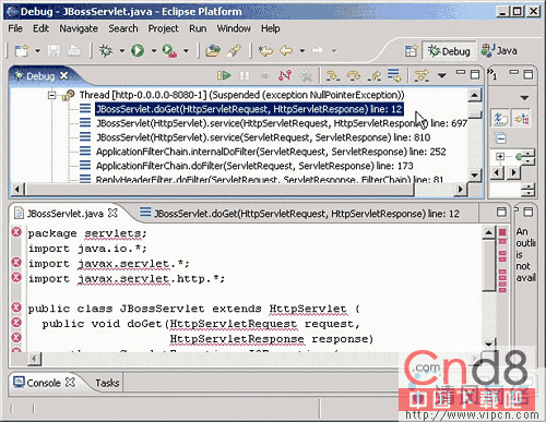 假如servlet应用在JBoss服务器上运行时产生了NullPointerException异常,该应用就会被挂起,同时Eclipse IDE的Debug视图中会显示出该异常。