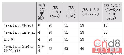 除了垃圾收集的时间开销之外,Java中的对象还会产生大量的空间开销。对于每一个已分配的对象,JVM将加上必要的内部信息以便垃圾收集过程顺利进行。另外,JVM还要加入一些Java语言规范所要求的信息,这些信息对于某些功能来说是必不可少的,比如在任意对象上同步的功能。假如把JVM内部为每一个对象分配的空间计入对象的占用空间,则小型Java对象要比C/C++中等价的对象大得多。下面的表格显示了几种不同JVM下一些简单对象的内存占用情况,其中“内容”列显示用户可访问内容的大小,其余各列显示不同JVM下对象实际占用的内存大小,从该表可以看出JVM额外增加的内存开销。