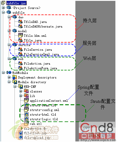 工程的类按SSH的层次结构划分为数据持久层、业务层和Web层;WEB-INF下的applicationContext.XML为Spring的配置文件,struts-config.xml为Struts的配置文件,file-upload.jsp为文件上传页面,file-list.jsp为文件列表页面。