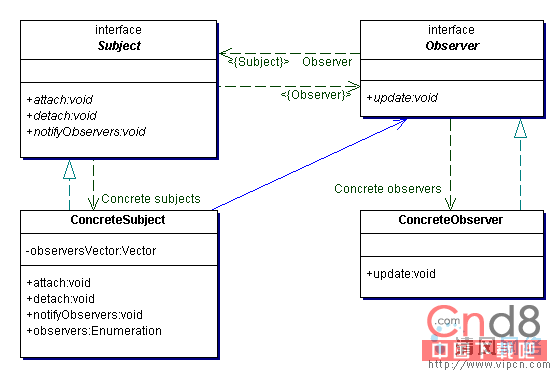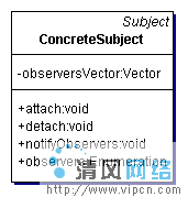 具体主题则是实现了抽象主题Subject接口的一个具体类,它给出了以上的三个操作的具体实现。从下面的源代码可以看出,这里给出的Java实现使用了一个Java向量来保存所有的观察者对象,而 attach() 和 detach() 操作则是对此向量的元素增减操作。