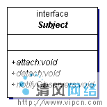 这个抽象主题接口规定出三个子类必须实现的操作,即 attach() 用来增加一个观察者对象;detach() 用来删除一个观察者对象;和notifyObservers() 用来通知各个观察者刷新它们自己。抽象主题角色实际上要求子类保持一个以所有的观察者对象为元素的列表。
